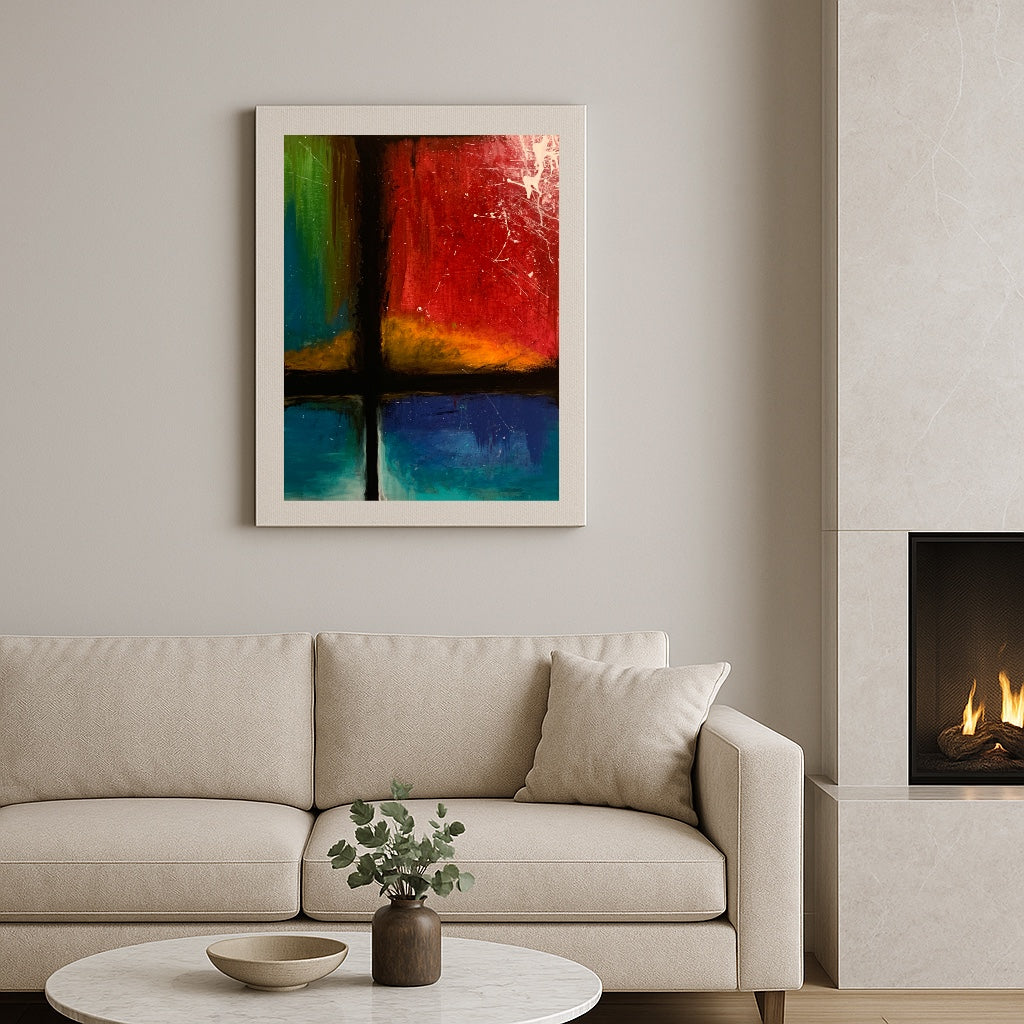 This original 18x24 inch acrylic on canvas artwork is a bold play of color and contrast. Deep reds and glowing orange meet cool turquoise blues and greens, divided by strong black lines. White splatter accents add raw energy and movement, giving the piece an urban, expressive edge.