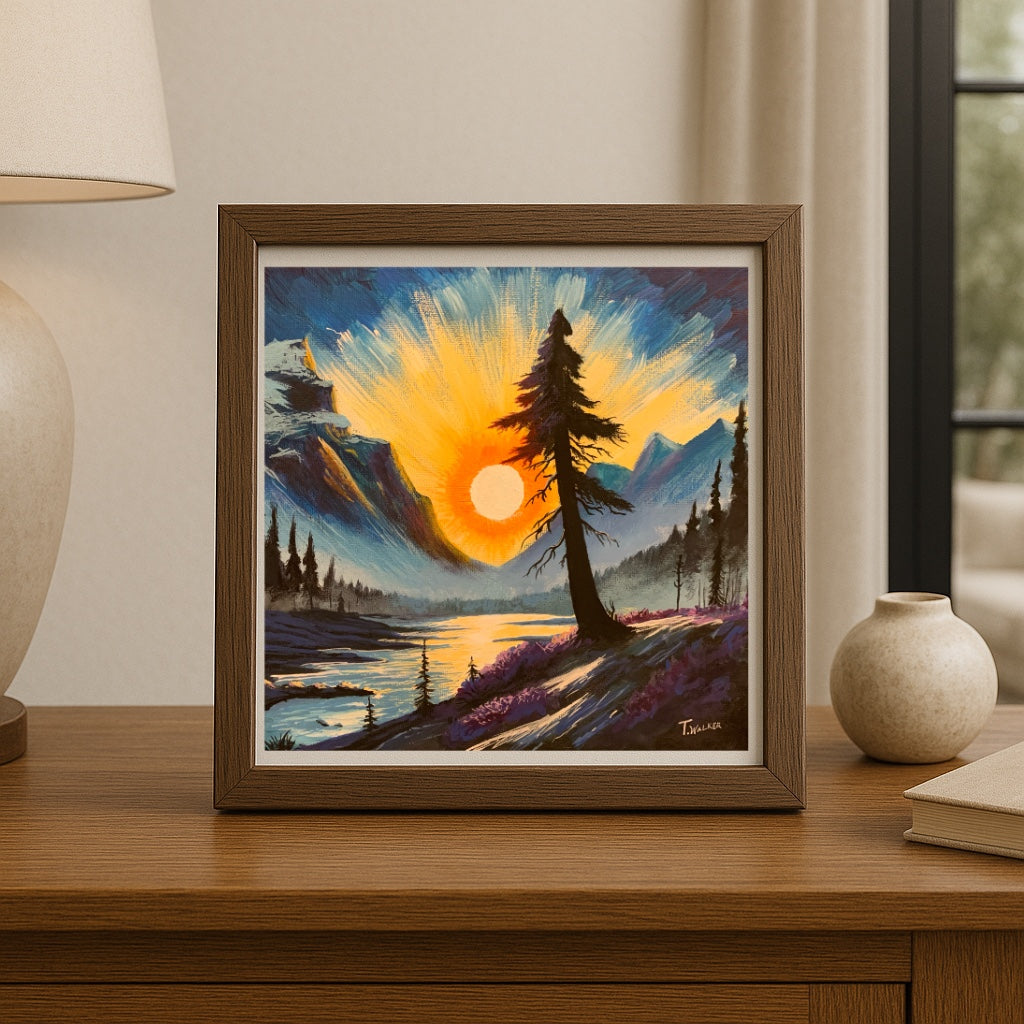 This 10” x 10” acrylic painting on canvas is a deeply personal piece. It represents all the darkness we face in life, and how the light — though it may feel out of reach — still shines beyond the mountains. The lone tree stands tall, surviving and reaching for that light, a symbol of resilience and hope.